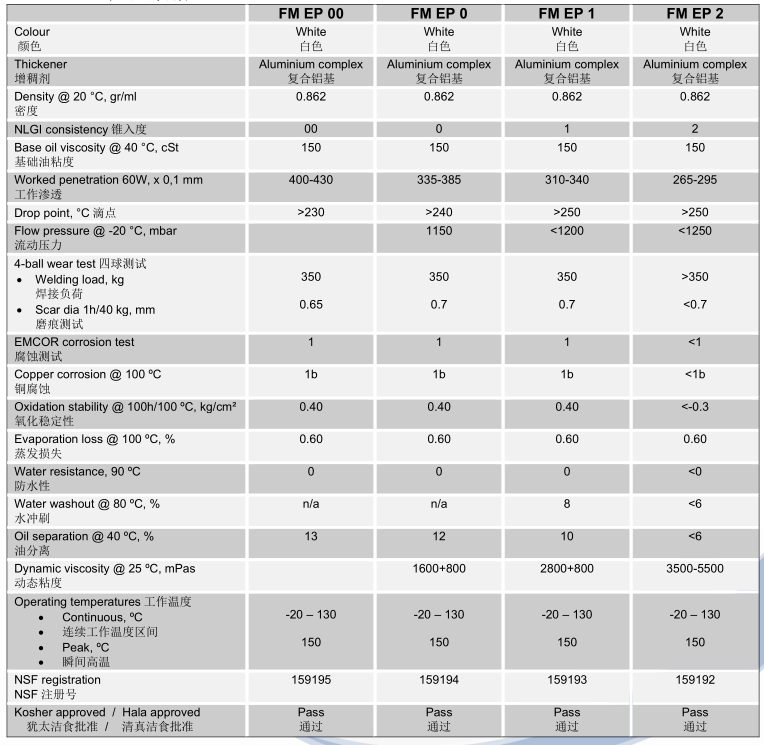 净泊Lubrichem FM EP是一个复合铝基脂,适用于任何需要食品级润滑剂的应用场合。 净泊Lubrichem FMEP是一种以白色矿物油为基础的产品,它由复合铝基、稳固的添加剂配方和经授权的固体润滑剂配制而成,该产品具有优异的润滑性能和高耐水性,在有水的工作环境下,其优良的附着力使润滑表现完美。 净泊Lubrichem FMEP可用于-20℃至150℃温度范围内的轴承,由于其优异的耐水性,非常适用于潮湿的环境中工作的链条或输送链的润滑,比较常见于包装车间和屠宰场、肉类加工厂,也可用于水阀或水龙头等关键的部位,为其提供长效润滑。
